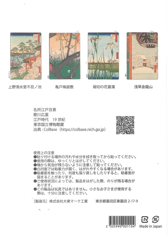 浮世絵ステッカー 名所江戸百景 大きさ(一枚当たり)約8.5×5.7㎝ 日本製 ・上野清水堂不忍ノ池 ・亀戸梅屋敷 ・堀切の花菖蒲 ・浅草金龍山